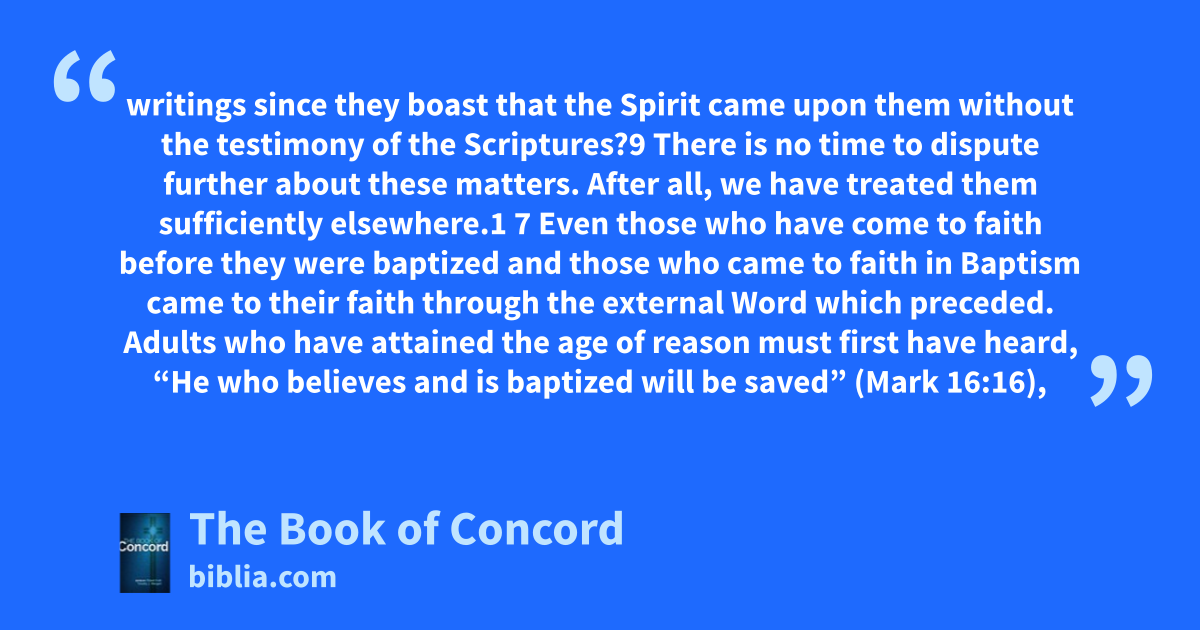 writings since they boast that the Spirit came upon them without the testimony of the Scriptures?9 There is no time to dispute further about these matters. After all, we have treated them sufficiently elsewhere.1 7 Even those who have come to faith before they were baptized and those who came to faith in Baptism came to their faith through the external Word which preceded. Adults who have attained the age of reason must first have heard, “He who believes and is baptized will be saved” (Mark 16:16),