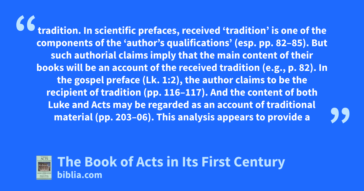 tradition. In scientific prefaces, received ‘tradition’ is one of the components of the ‘author’s qualifications’ (esp. pp. 82–85). But such authorial claims imply that the main content of their books will be an account of the received tradition (e.g., p. 82). In the gospel preface (Lk. 1:2), the author claims to be the recipient of tradition (pp. 116–117). And the content of both Luke and Acts may be regarded as an account of traditional material (pp. 203–06). This analysis appears to provide a