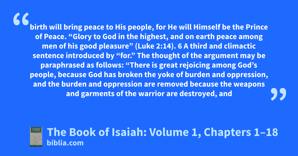 birth will bring peace to His people, for He will Himself be the Prince of Peace. “Glory to God in the highest, and on earth peace among men of his good pleasure” (Luke 2:14). 6 A third and climactic sentence introduced by “for.” The thought of the argument may be paraphrased as follows: “There is great rejoicing among God’s people, because God has broken the yoke of burden and oppression, and the burden and oppression are removed because the weapons and garments of the warrior are destroyed, and
