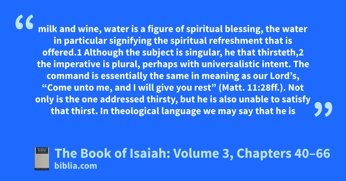 milk and wine, water is a figure of spiritual blessing, the water in particular signifying the spiritual refreshment that is offered.1 Although the subject is singular, he that thirsteth,2 the imperative is plural, perhaps with universalistic intent. The command is essentially the same in meaning as our Lord’s, “Come unto me, and I will give you rest” (Matt. 11:28ff.). Not only is the one addressed thirsty, but he is also unable to satisfy that thirst. In theological language we may say that he is