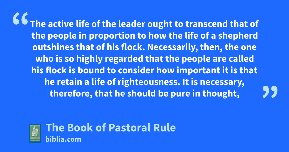The active life of the leader ought to transcend that of the people in proportion to how the life of a shepherd outshines that of his flock. Necessarily, then, the one who is so highly regarded that the people are called his flock is bound to consider how important it is that he retain a life of righteousness. It is necessary, therefore, that he should be pure in thought,