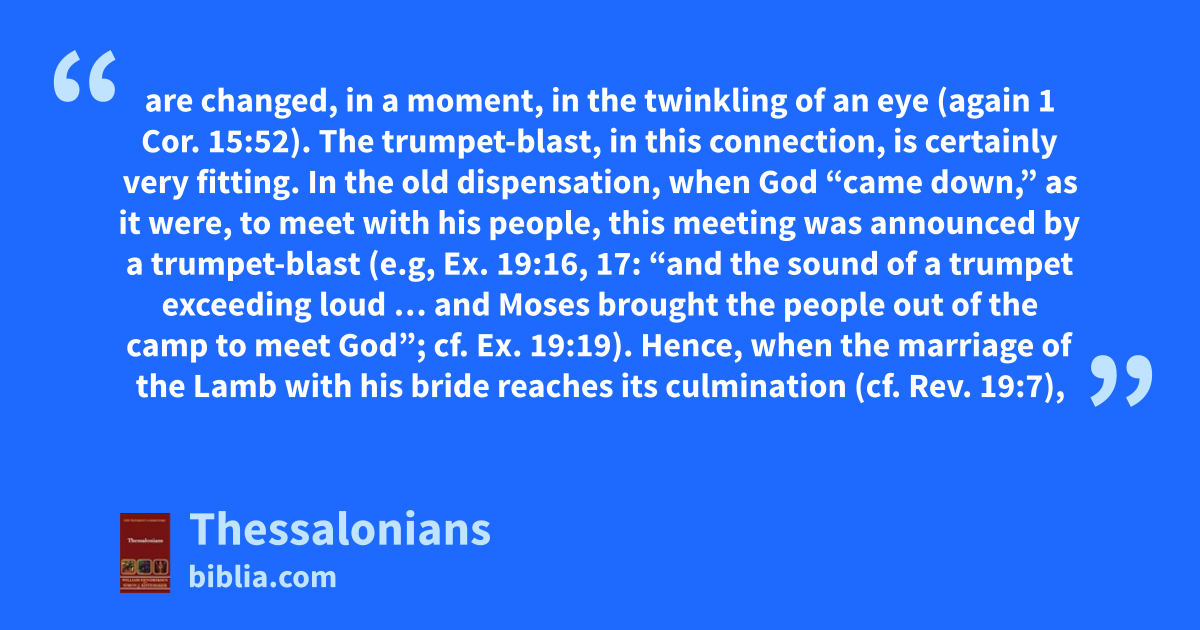 are changed, in a moment, in the twinkling of an eye (again 1 Cor. 15:52). The trumpet-blast, in this connection, is certainly very fitting. In the old dispensation, when God “came down,” as it were, to meet with his people, this meeting was announced by a trumpet-blast (e.g, Ex. 19:16, 17: “and the sound of a trumpet exceeding loud … and Moses brought the people out of the camp to meet God”; cf. Ex. 19:19). Hence, when the marriage of the Lamb with his bride reaches its culmination (cf. Rev. 19:7),