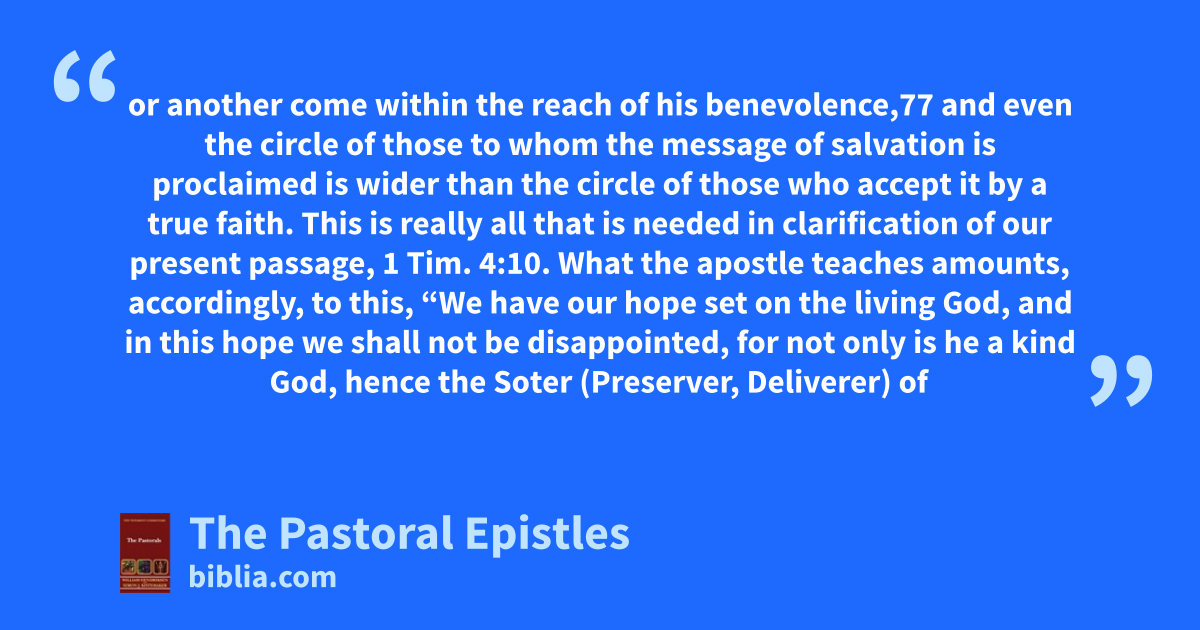 or another come within the reach of his benevolence,77 and even the circle of those to whom the message of salvation is proclaimed is wider than the circle of those who accept it by a true faith. This is really all that is needed in clarification of our present passage, 1 Tim. 4:10. What the apostle teaches amounts, accordingly, to this, “We have our hope set on the living God, and in this hope we shall not be disappointed, for not only is he a kind God, hence the Soter (Preserver, Deliverer) of