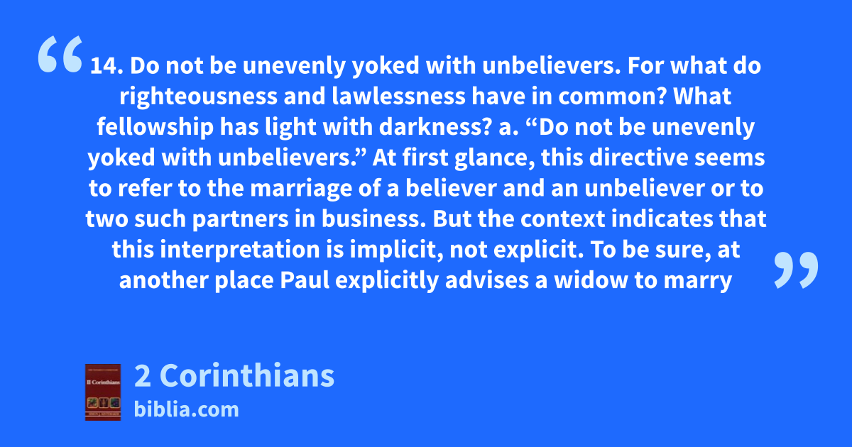 14. Do not be unevenly yoked with unbelievers. For what do righteousness and lawlessness have in common? What fellowship has light with darkness? a. “Do not be unevenly yoked with unbelievers.” At first glance, this directive seems to refer to the marriage of a believer and an unbeliever or to two such partners in business. But the context indicates that this interpretation is implicit, not explicit. To be sure, at another place Paul explicitly advises a widow to marry