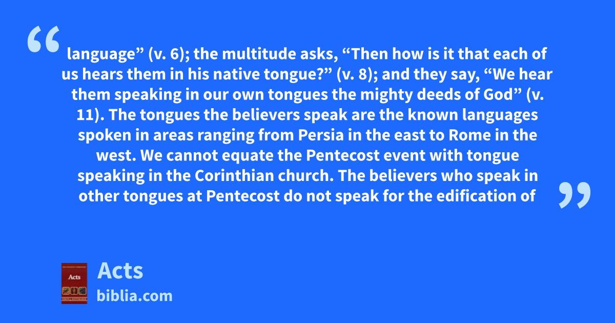 language” (v. 6); the multitude asks, “Then how is it that each of us hears them in his native tongue?” (v. 8); and they say, “We hear them speaking in our own tongues the mighty deeds of God” (v. 11). The tongues the believers speak are the known languages spoken in areas ranging from Persia in the east to Rome in the west. We cannot equate the Pentecost event with tongue speaking in the Corinthian church. The believers who speak in other tongues at Pentecost do not speak for the edification of