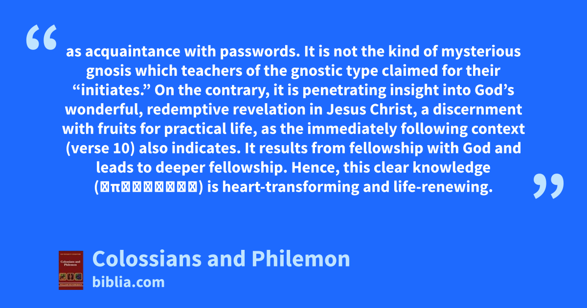 as acquaintance with passwords. It is not the kind of mysterious gnosis which teachers of the gnostic type claimed for their “initiates.” On the contrary, it is penetrating insight into God’s wonderful, redemptive revelation in Jesus Christ, a discernment with fruits for practical life, as the immediately following context (verse 10) also indicates. It results from fellowship with God and leads to deeper fellowship. Hence, this clear knowledge (ἐπίγνωσις) is heart-transforming and life-renewing.
