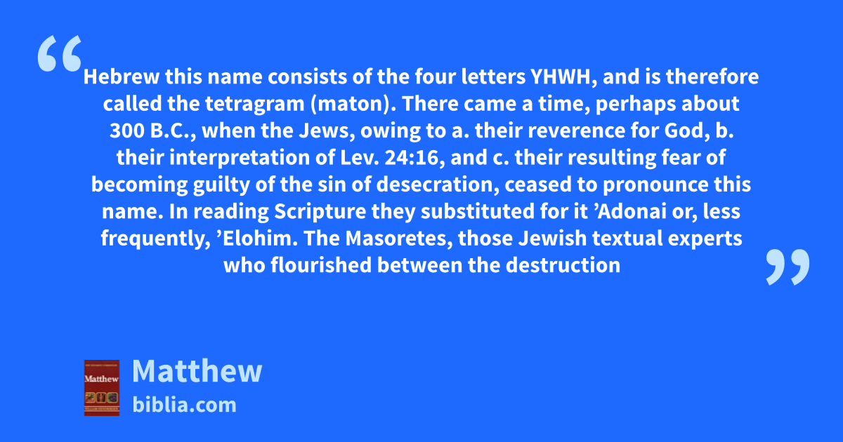 Hebrew this name consists of the four letters YHWH, and is therefore called the tetragram (maton). There came a time, perhaps about 300 B.C., when the Jews, owing to a. their reverence for God, b. their interpretation of Lev. 24:16, and c. their resulting fear of becoming guilty of the sin of desecration, ceased to pronounce this name. In reading Scripture they substituted for it ’Adonai or, less frequently, ’Elohim. The Masoretes, those Jewish textual experts who flourished between the destruction