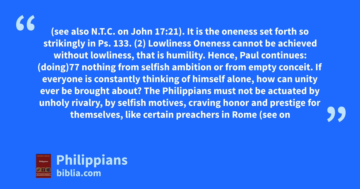 (see also N.T.C. on John 17:21). It is the oneness set forth so strikingly in Ps. 133. (2) Lowliness Oneness cannot be achieved without lowliness, that is humility. Hence, Paul continues: (doing)77 nothing from selfish ambition or from empty conceit. If everyone is constantly thinking of himself alone, how can unity ever be brought about? The Philippians must not be actuated by unholy rivalry, by selfish motives, craving honor and prestige for themselves, like certain preachers in Rome (see on
