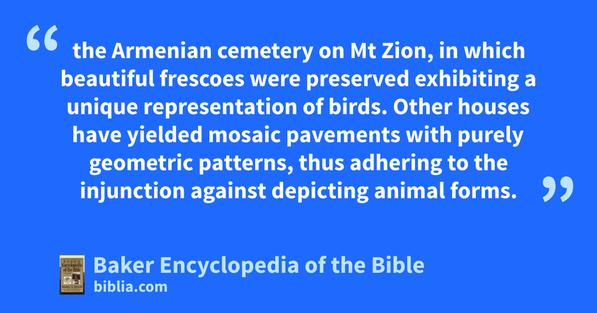 the Armenian cemetery on Mt Zion, in which beautiful frescoes were preserved exhibiting a unique representation of birds. Other houses have yielded mosaic pavements with purely geometric patterns, thus adhering to the injunction against depicting animal forms.