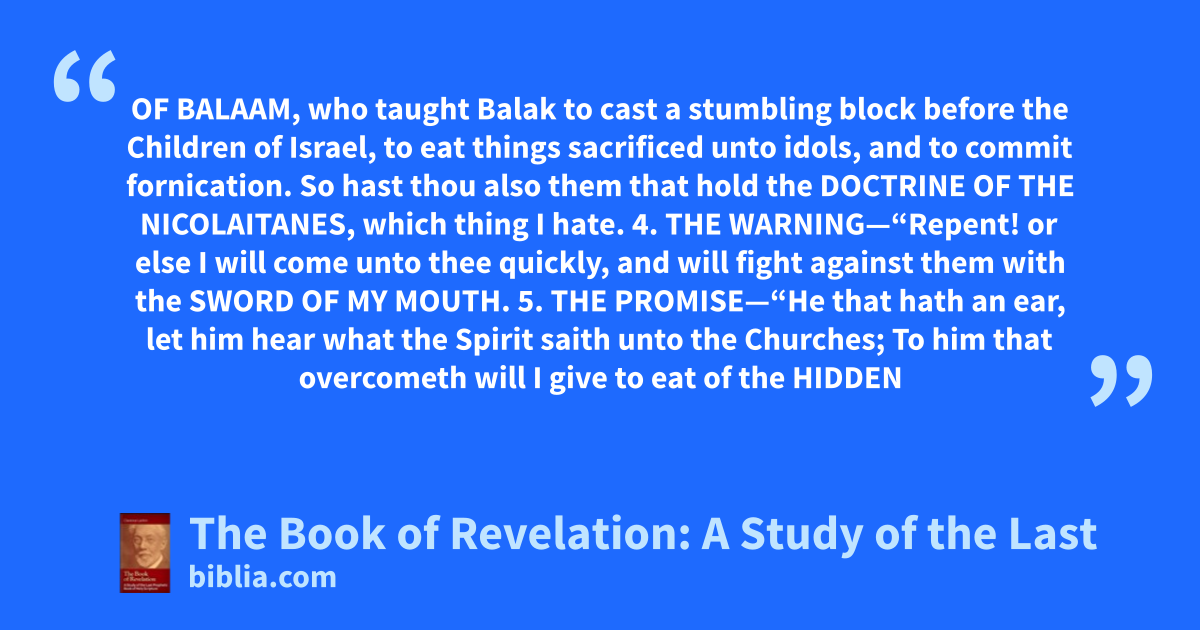 OF BALAAM, who taught Balak to cast a stumbling block before the Children of Israel, to eat things sacrificed unto idols, and to commit fornication. So hast thou also them that hold the DOCTRINE OF THE NICOLAITANES, which thing I hate. 4. THE WARNING—“Repent! or else I will come unto thee quickly, and will fight against them with the SWORD OF MY MOUTH. 5. THE PROMISE—“He that hath an ear, let him hear what the Spirit saith unto the Churches; To him that overcometh will I give to eat of the HIDDEN