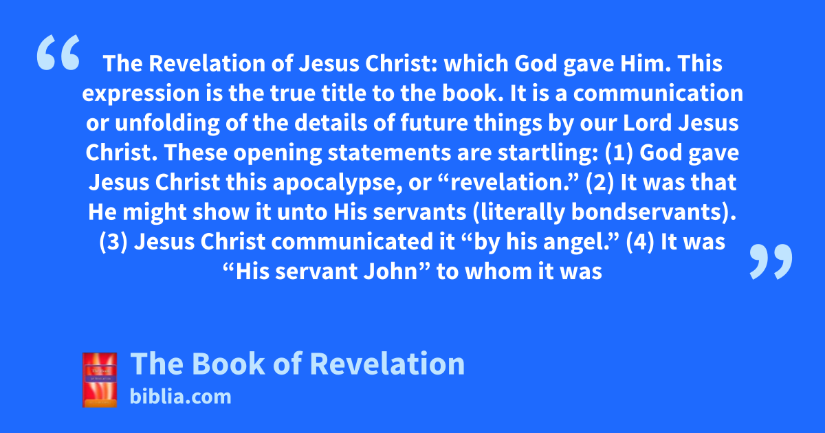 The Revelation of Jesus Christ: which God gave Him. This expression is the true title to the book. It is a communication or unfolding of the details of future things by our Lord Jesus Christ. These opening statements are startling: (1) God gave Jesus Christ this apocalypse, or “revelation.” (2) It was that He might show it unto His servants (literally bondservants). (3) Jesus Christ communicated it “by his angel.” (4) It was “His servant John” to whom it was