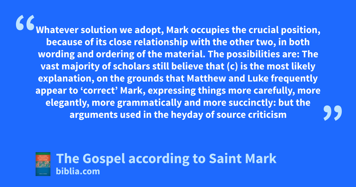 Whatever solution we adopt, Mark occupies the crucial position, because of its close relationship with the other two, in both wording and ordering of the material. The possibilities are: The vast majority of scholars still believe that (c) is the most likely explanation, on the grounds that Matthew and Luke frequently appear to ‘correct’ Mark, expressing things more carefully, more elegantly, more grammatically and more succinctly: but the arguments used in the heyday of source criticism
