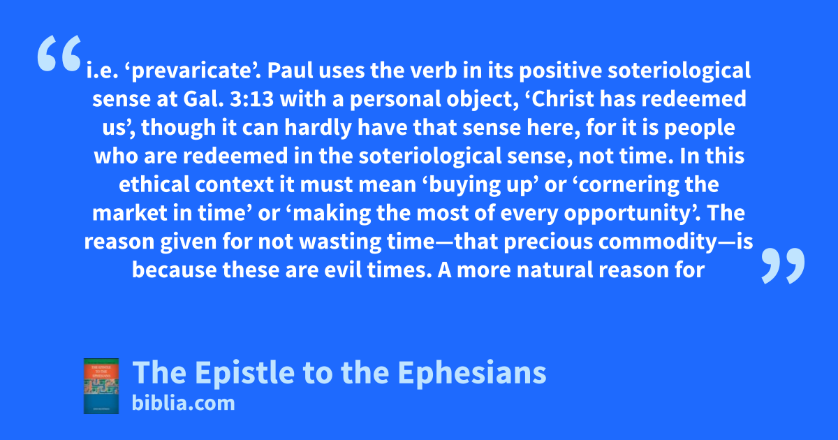 i.e. ‘prevaricate’. Paul uses the verb in its positive soteriological sense at Gal. 3:13 with a personal object, ‘Christ has redeemed us’, though it can hardly have that sense here, for it is people who are redeemed in the soteriological sense, not time. In this ethical context it must mean ‘buying up’ or ‘cornering the market in time’ or ‘making the most of every opportunity’. The reason given for not wasting time—that precious commodity—is because these are evil times. A more natural reason for