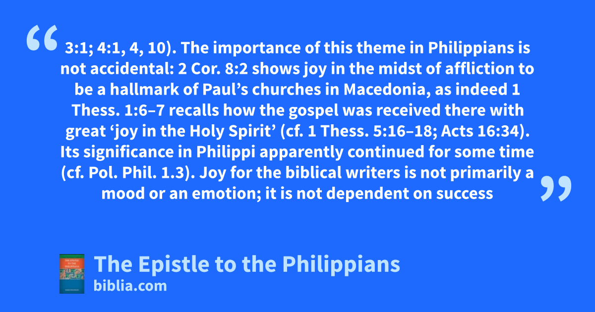 3:1; 4:1, 4, 10). The importance of this theme in Philippians is not accidental: 2 Cor. 8:2 shows joy in the midst of affliction to be a hallmark of Paul’s churches in Macedonia, as indeed 1 Thess. 1:6–7 recalls how the gospel was received there with great ‘joy in the Holy Spirit’ (cf. 1 Thess. 5:16–18; Acts 16:34). Its significance in Philippi apparently continued for some time (cf. Pol. Phil. 1.3). Joy for the biblical writers is not primarily a mood or an emotion; it is not dependent on success