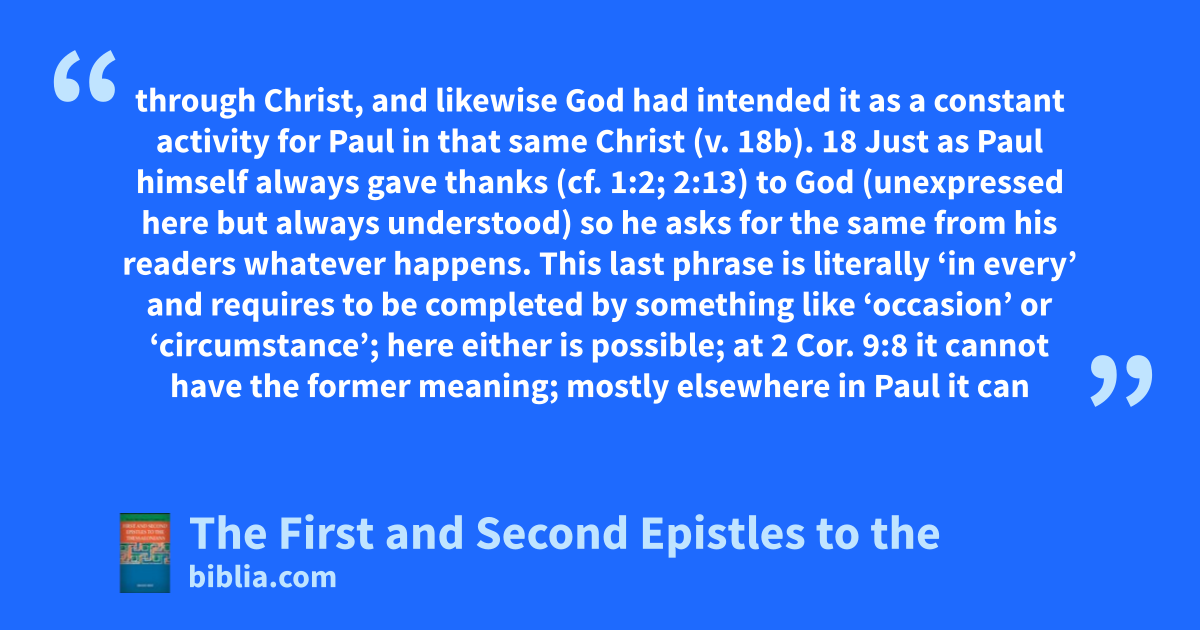 through Christ, and likewise God had intended it as a constant activity for Paul in that same Christ (v. 18b). 18 Just as Paul himself always gave thanks (cf. 1:2; 2:13) to God (unexpressed here but always understood) so he asks for the same from his readers whatever happens. This last phrase is literally ‘in every’ and requires to be completed by something like ‘occasion’ or ‘circumstance’; here either is possible; at 2 Cor. 9:8 it cannot have the former meaning; mostly elsewhere in Paul it can