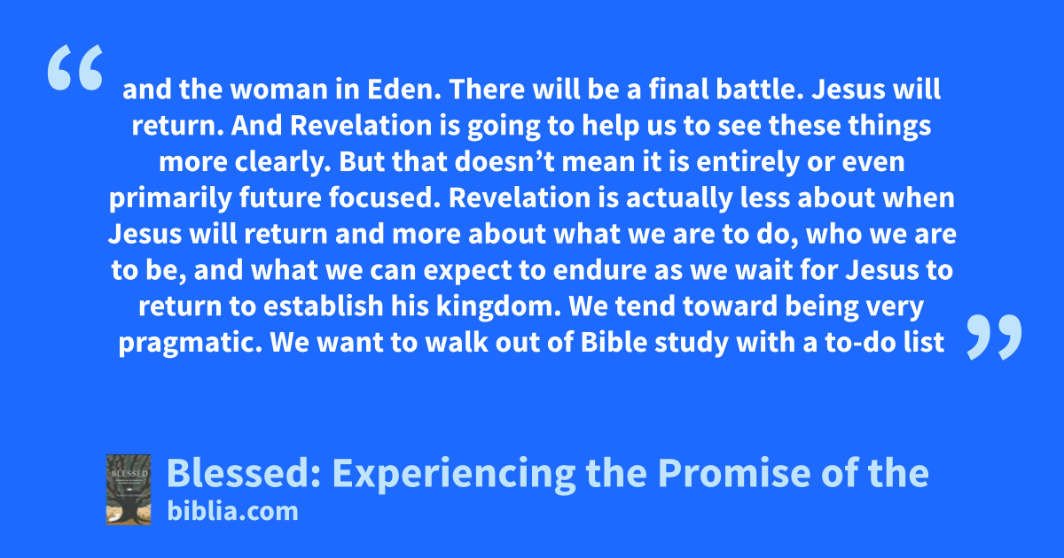 and the woman in Eden. There will be a final battle. Jesus will return. And Revelation is going to help us to see these things more clearly. But that doesn’t mean it is entirely or even primarily future focused. Revelation is actually less about when Jesus will return and more about what we are to do, who we are to be, and what we can expect to endure as we wait for Jesus to return to establish his kingdom. We tend toward being very pragmatic. We want to walk out of Bible study with a to-do list