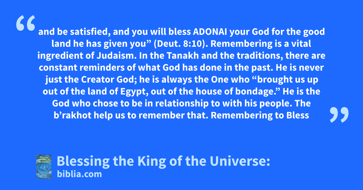 and be satisfied, and you will bless ADONAI your God for the good land he has given you” (Deut. 8:10). Remembering is a vital ingredient of Judaism. In the Tanakh and the traditions, there are constant reminders of what God has done in the past. He is never just the Creator God; he is always the One who “brought us up out of the land of Egypt, out of the house of bondage.” He is the God who chose to be in relationship to with his people. The b’rakhot help us to remember that. Remembering to Bless