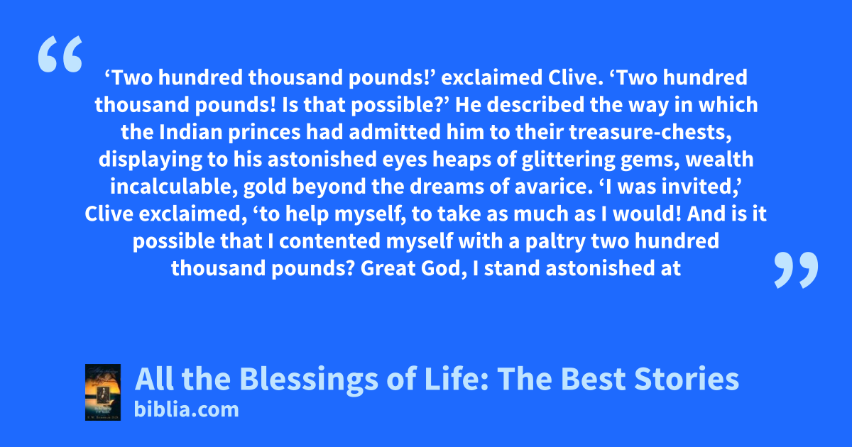 ‘Two hundred thousand pounds!’ exclaimed Clive. ‘Two hundred thousand pounds! Is that possible?’ He described the way in which the Indian princes had admitted him to their treasure-chests, displaying to his astonished eyes heaps of glittering gems, wealth incalculable, gold beyond the dreams of avarice. ‘I was invited,’ Clive exclaimed, ‘to help myself, to take as much as I would! And is it possible that I contented myself with a paltry two hundred thousand pounds? Great God, I stand astonished at