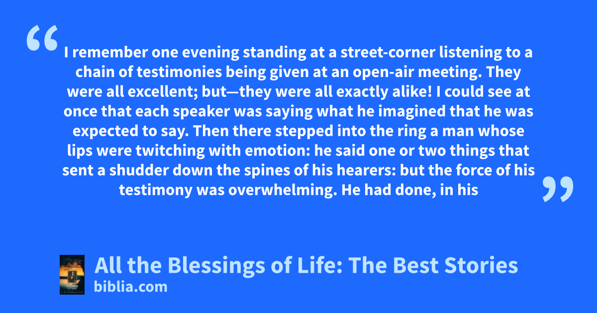 I remember one evening standing at a street-corner listening to a chain of testimonies being given at an open-air meeting. They were all excellent; but—they were all exactly alike! I could see at once that each speaker was saying what he imagined that he was expected to say. Then there stepped into the ring a man whose lips were twitching with emotion: he said one or two things that sent a shudder down the spines of his hearers: but the force of his testimony was overwhelming. He had done, in his