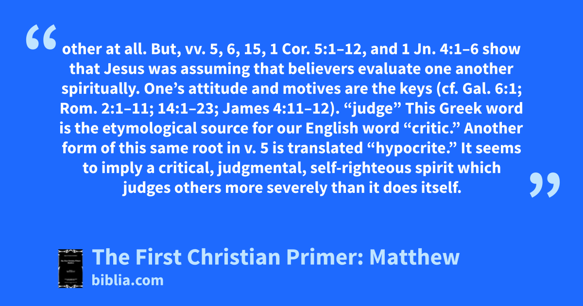 other at all. But, vv. 5, 6, 15, 1 Cor. 5:1–12, and 1 Jn. 4:1–6 show that Jesus was assuming that believers evaluate one another spiritually. One’s attitude and motives are the keys (cf. Gal. 6:1; Rom. 2:1–11; 14:1–23; James 4:11–12). “judge” This Greek word is the etymological source for our English word “critic.” Another form of this same root in v. 5 is translated “hypocrite.” It seems to imply a critical, judgmental, self-righteous spirit which judges others more severely than it does itself.