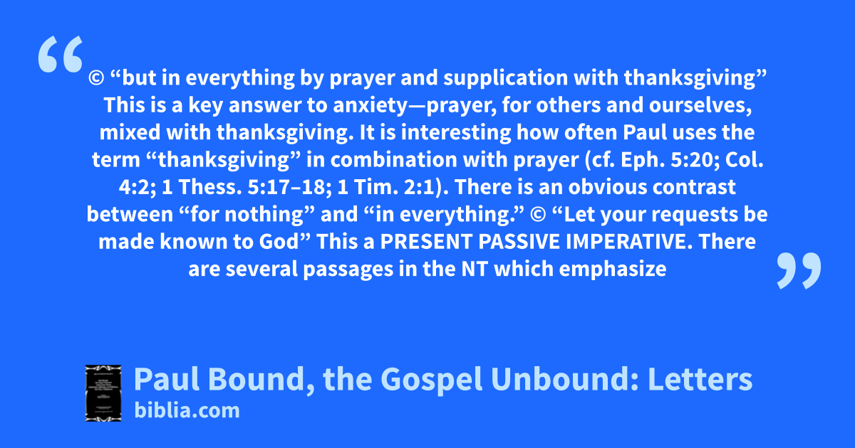 © “but in everything by prayer and supplication with thanksgiving” This is a key answer to anxiety—prayer, for others and ourselves, mixed with thanksgiving. It is interesting how often Paul uses the term “thanksgiving” in combination with prayer (cf. Eph. 5:20; Col. 4:2; 1 Thess. 5:17–18; 1 Tim. 2:1). There is an obvious contrast between “for nothing” and “in everything.” © “Let your requests be made known to God” This a PRESENT PASSIVE IMPERATIVE. There are several passages in the NT which emphasize