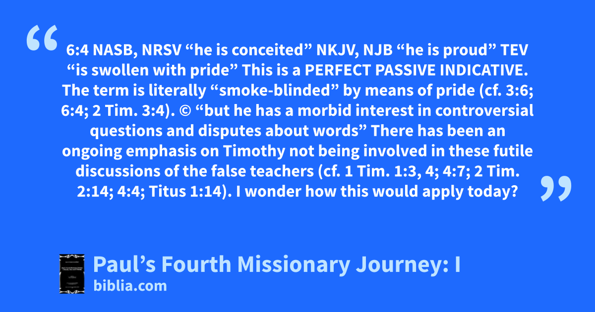 6:4 NASB, NRSV “he is conceited” NKJV, NJB “he is proud” TEV “is swollen with pride” This is a PERFECT PASSIVE INDICATIVE. The term is literally “smoke-blinded” by means of pride (cf. 3:6; 6:4; 2 Tim. 3:4). © “but he has a morbid interest in controversial questions and disputes about words” There has been an ongoing emphasis on Timothy not being involved in these futile discussions of the false teachers (cf. 1 Tim. 1:3, 4; 4:7; 2 Tim. 2:14; 4:4; Titus 1:14). I wonder how this would apply today?