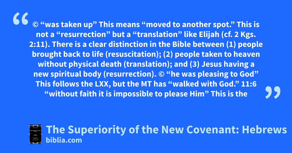 © “was taken up” This means “moved to another spot.” This is not a “resurrection” but a “translation” like Elijah (cf. 2 Kgs. 2:11). There is a clear distinction in the Bible between (1) people brought back to life (resuscitation); (2) people taken to heaven without physical death (translation); and (3) Jesus having a new spiritual body (resurrection). © “he was pleasing to God” This follows the LXX, but the MT has “walked with God.” 11:6 “without faith it is impossible to please Him” This is the