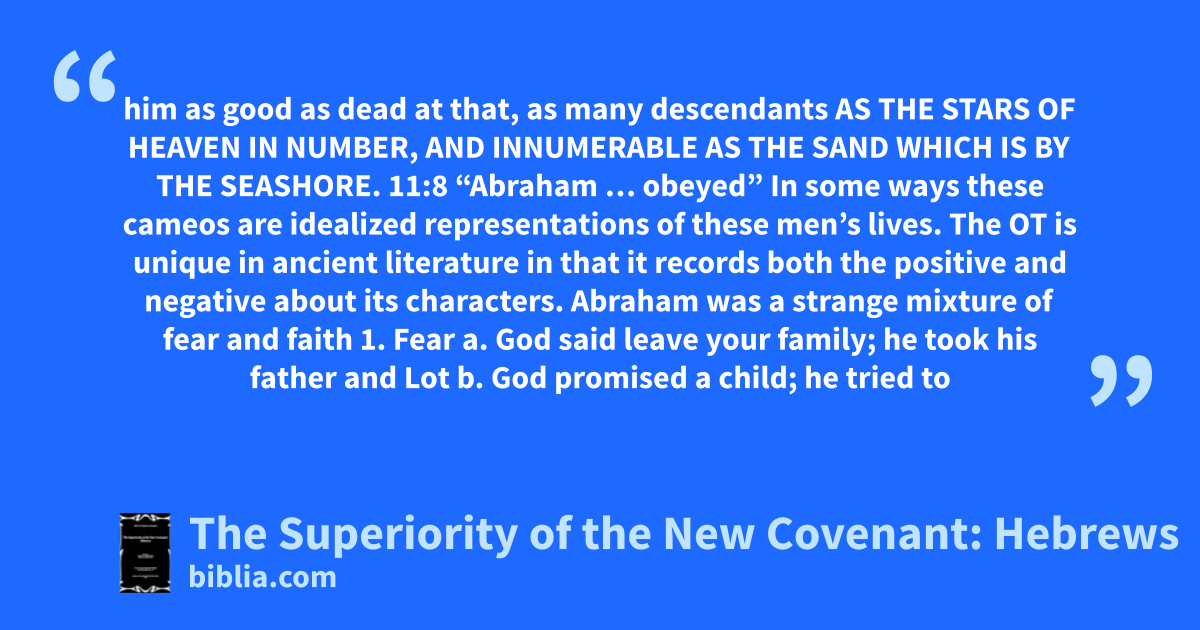 him as good as dead at that, as many descendants AS THE STARS OF HEAVEN IN NUMBER, AND INNUMERABLE AS THE SAND WHICH IS BY THE SEASHORE. 11:8 “Abraham … obeyed” In some ways these cameos are idealized representations of these men’s lives. The OT is unique in ancient literature in that it records both the positive and negative about its characters. Abraham was a strange mixture of fear and faith 1. Fear a. God said leave your family; he took his father and Lot b. God promised a child; he tried to