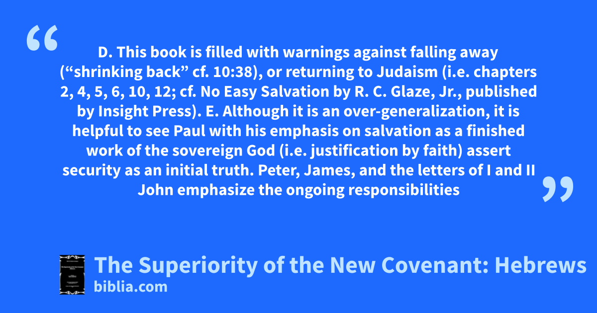 D. This book is filled with warnings against falling away (“shrinking back” cf. 10:38), or returning to Judaism (i.e. chapters 2, 4, 5, 6, 10, 12; cf. No Easy Salvation by R. C. Glaze, Jr., published by Insight Press). E. Although it is an over-generalization, it is helpful to see Paul with his emphasis on salvation as a finished work of the sovereign God (i.e. justification by faith) assert security as an initial truth. Peter, James, and the letters of I and II John emphasize the ongoing responsibilities