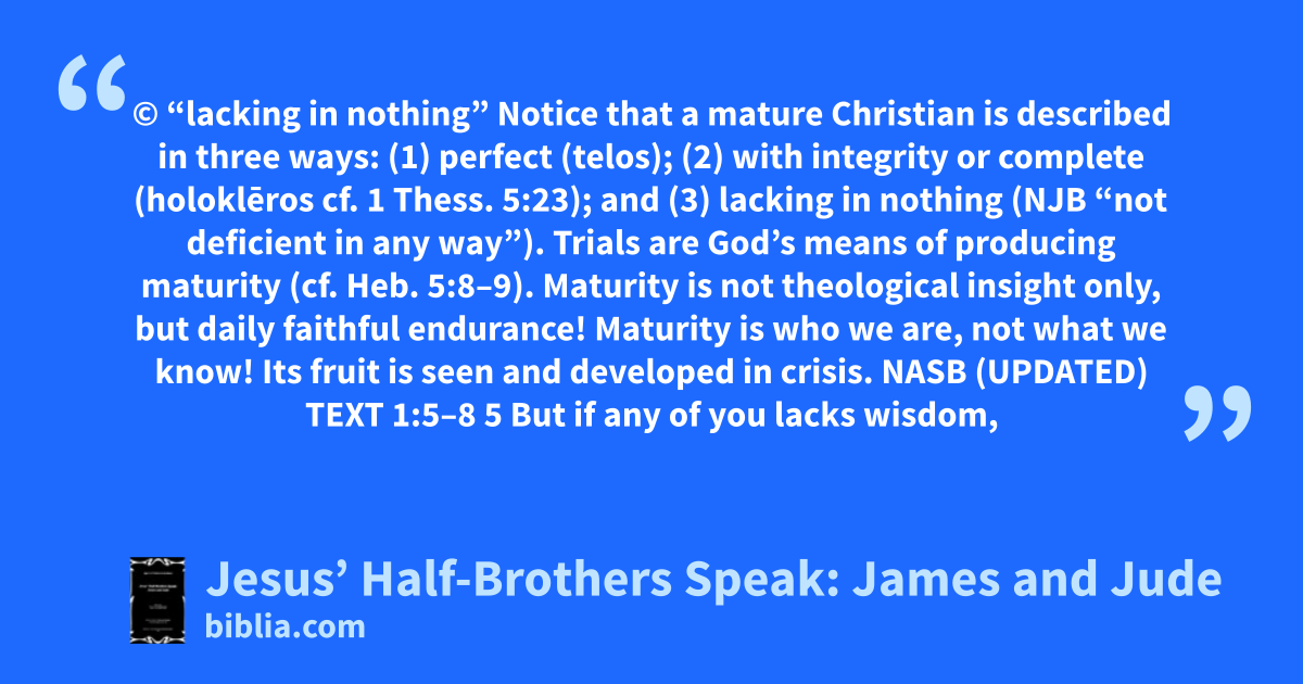 © “lacking in nothing” Notice that a mature Christian is described in three ways: (1) perfect (telos); (2) with integrity or complete (holoklēros cf. 1 Thess. 5:23); and (3) lacking in nothing (NJB “not deficient in any way”). Trials are God’s means of producing maturity (cf. Heb. 5:8–9). Maturity is not theological insight only, but daily faithful endurance! Maturity is who we are, not what we know! Its fruit is seen and developed in crisis. NASB (UPDATED) TEXT 1:5–8 5 But if any of you lacks wisdom,