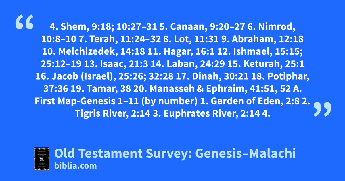 4. Shem, 9:18; 10:27–31 5. Canaan, 9:20–27 6. Nimrod, 10:8–10 7. Terah, 11:24–32 8. Lot, 11:31 9. Abraham, 12:18 10. Melchizedek, 14:18 11. Hagar, 16:1 12. Ishmael, 15:15; 25:12–19 13. Isaac, 21:3 14. Laban, 24:29 15. Keturah, 25:1 16. Jacob (Israel), 25:26; 32:28 17. Dinah, 30:21 18. Potiphar, 37:36 19. Tamar, 38 20. Manasseh & Ephraim, 41:51, 52 A. First Map-Genesis 1–11 (by number) 1. Garden of Eden, 2:8 2. Tigris River, 2:14 3. Euphrates River, 2:14 4.