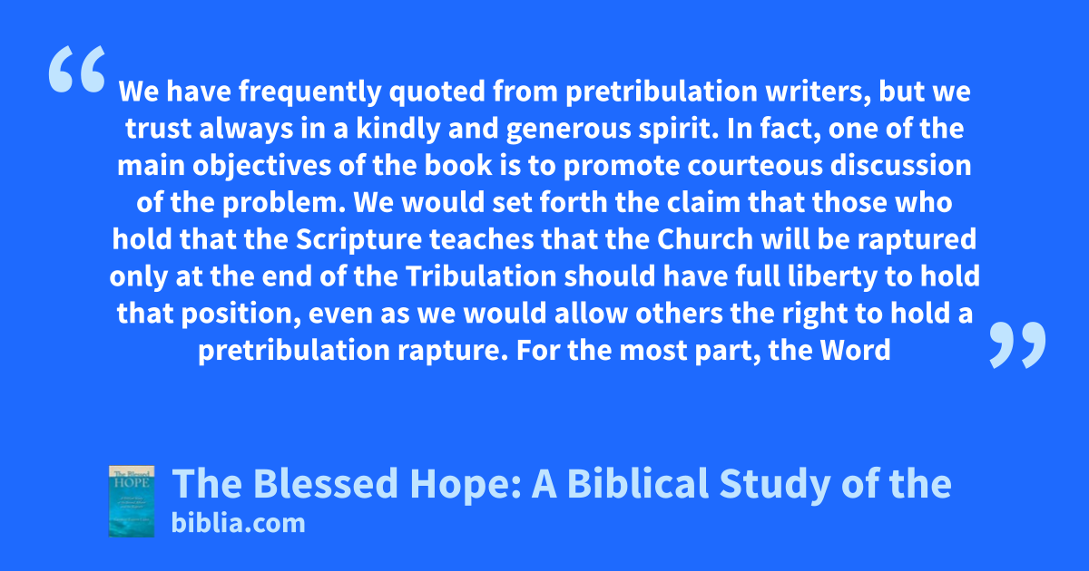 We have frequently quoted from pretribulation writers, but we trust always in a kindly and generous spirit. In fact, one of the main objectives of the book is to promote courteous discussion of the problem. We would set forth the claim that those who hold that the Scripture teaches that the Church will be raptured only at the end of the Tribulation should have full liberty to hold that position, even as we would allow others the right to hold a pretribulation rapture. For the most part, the Word