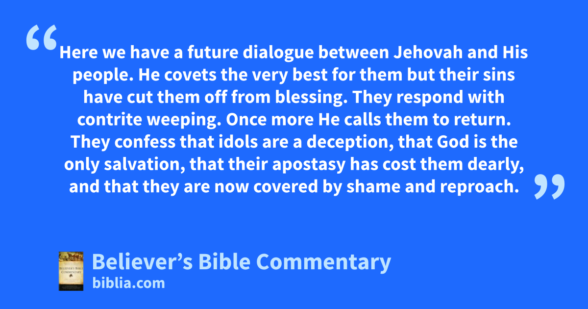 Here we have a future dialogue between Jehovah and His people. He covets the very best for them but their sins have cut them off from blessing. They respond with contrite weeping. Once more He calls them to return. They confess that idols are a deception, that God is the only salvation, that their apostasy has cost them dearly, and that they are now covered by shame and reproach.