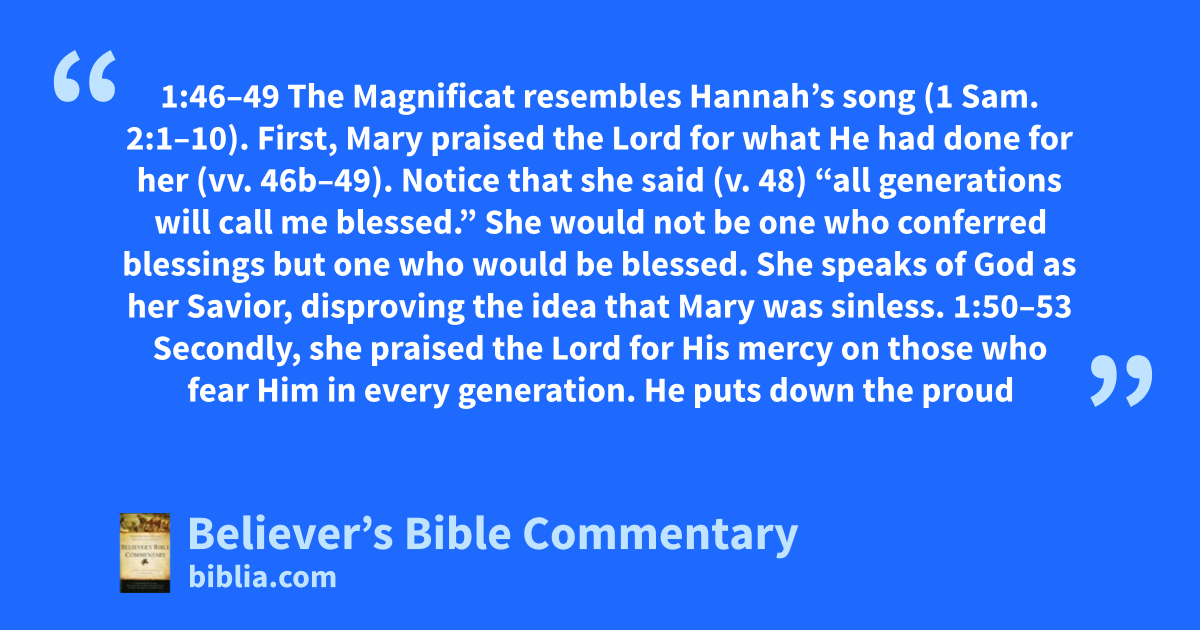 1:46–49 The Magnificat resembles Hannah’s song (1 Sam. 2:1–10). First, Mary praised the Lord for what He had done for her (vv. 46b–49). Notice that she said (v. 48) “all generations will call me blessed.” She would not be one who conferred blessings but one who would be blessed. She speaks of God as her Savior, disproving the idea that Mary was sinless. 1:50–53 Secondly, she praised the Lord for His mercy on those who fear Him in every generation. He puts down the proud