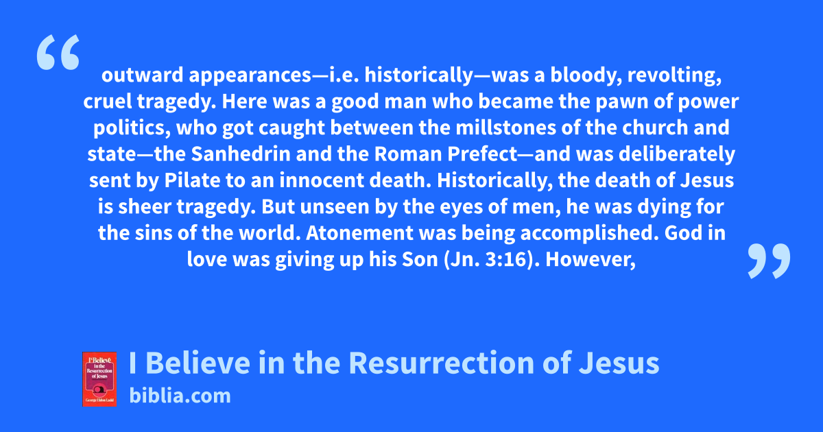 outward appearances—i.e. historically—was a bloody, revolting, cruel tragedy. Here was a good man who became the pawn of power politics, who got caught between the millstones of the church and state—the Sanhedrin and the Roman Prefect—and was deliberately sent by Pilate to an innocent death. Historically, the death of Jesus is sheer tragedy. But unseen by the eyes of men, he was dying for the sins of the world. Atonement was being accomplished. God in love was giving up his Son (Jn. 3:16). However,