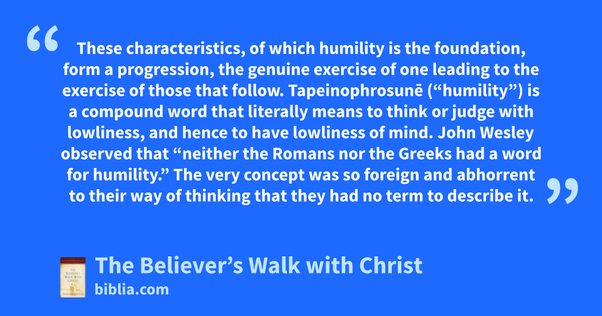 These characteristics, of which humility is the foundation, form a progression, the genuine exercise of one leading to the exercise of those that follow. Tapeinophrosunē (“humility”) is a compound word that literally means to think or judge with lowliness, and hence to have lowliness of mind. John Wesley observed that “neither the Romans nor the Greeks had a word for humility.” The very concept was so foreign and abhorrent to their way of thinking that they had no term to describe it.
