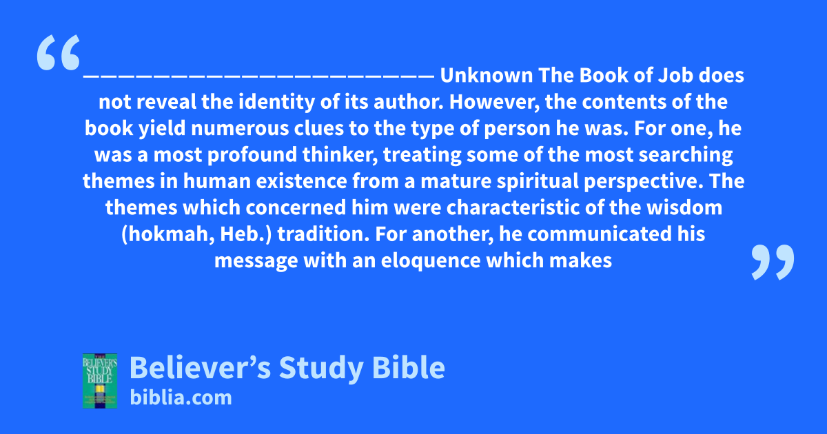 ———————————————————— Unknown The Book of Job does not reveal the identity of its author. However, the contents of the book yield numerous clues to the type of person he was. For one, he was a most profound thinker, treating some of the most searching themes in human existence from a mature spiritual perspective. The themes which concerned him were characteristic of the wisdom (hokmah, Heb.) tradition. For another, he communicated his message with an eloquence which makes