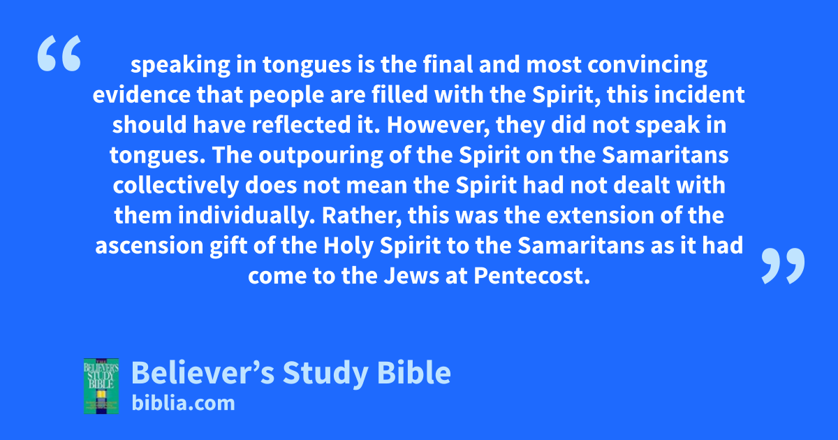 speaking in tongues is the final and most convincing evidence that people are filled with the Spirit, this incident should have reflected it. However, they did not speak in tongues. The outpouring of the Spirit on the Samaritans collectively does not mean the Spirit had not dealt with them individually. Rather, this was the extension of the ascension gift of the Holy Spirit to the Samaritans as it had come to the Jews at Pentecost.