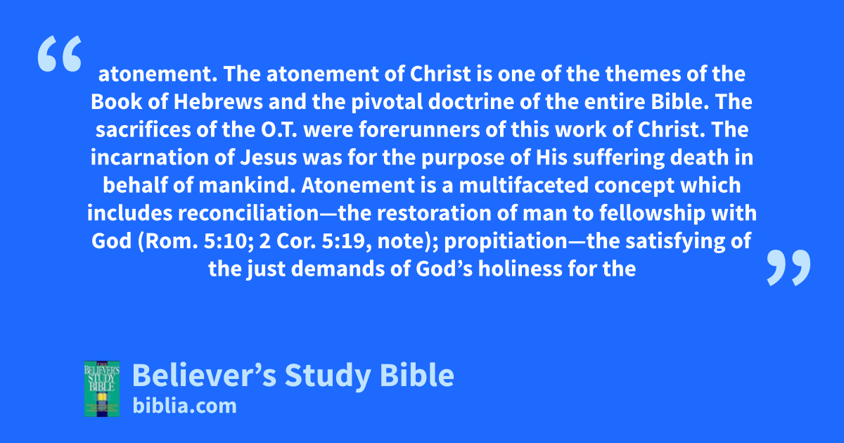atonement. The atonement of Christ is one of the themes of the Book of Hebrews and the pivotal doctrine of the entire Bible. The sacrifices of the O.T. were forerunners of this work of Christ. The incarnation of Jesus was for the purpose of His suffering death in behalf of mankind. Atonement is a multifaceted concept which includes reconciliation—the restoration of man to fellowship with God (Rom. 5:10; 2 Cor. 5:19, note); propitiation—the satisfying of the just demands of God’s holiness for the