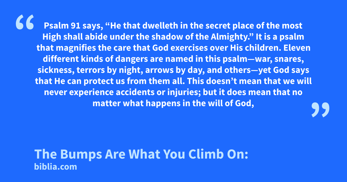 Psalm 91 says, “He that dwelleth in the secret place of the most High shall abide under the shadow of the Almighty.” It is a psalm that magnifies the care that God exercises over His children. Eleven different kinds of dangers are named in this psalm—war, snares, sickness, terrors by night, arrows by day, and others—yet God says that He can protect us from them all. This doesn’t mean that we will never experience accidents or injuries; but it does mean that no matter what happens in the will of God,