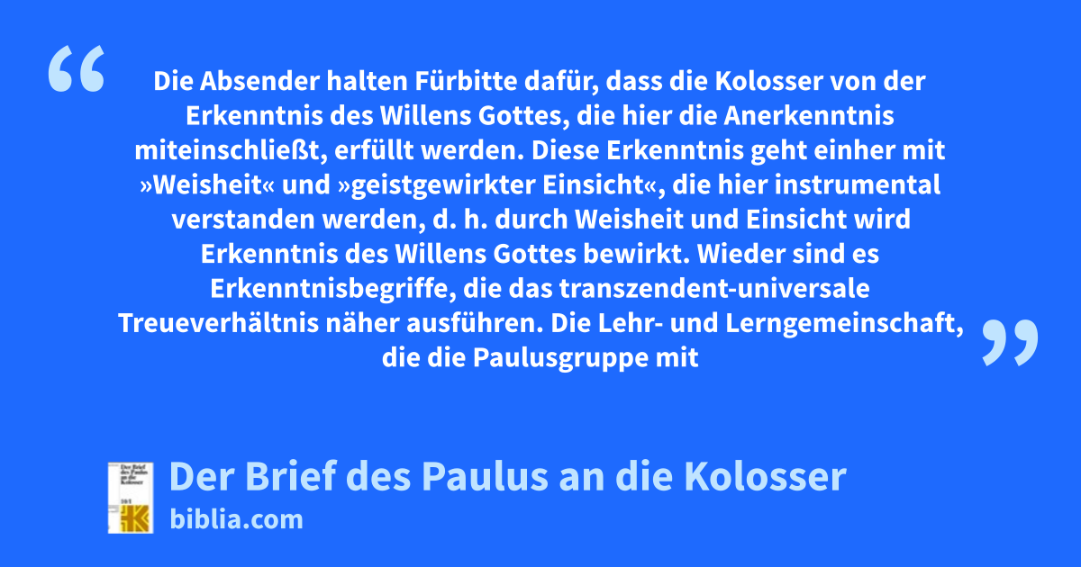 Die Absender halten Fürbitte dafür, dass die Kolosser von der Erkenntnis des Willens Gottes, die hier die Anerkenntnis miteinschließt, erfüllt werden. Diese Erkenntnis geht einher mit »Weisheit« und »geistgewirkter Einsicht«, die hier instrumental verstanden werden, d. h. durch Weisheit und Einsicht wird Erkenntnis des Willens Gottes bewirkt. Wieder sind es Erkenntnisbegriffe, die das transzendent-universale Treueverhältnis näher ausführen. Die Lehr- und Lerngemeinschaft, die die Paulusgruppe mit