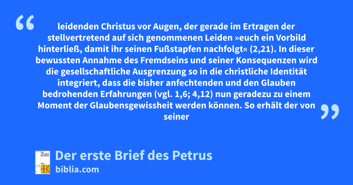 leidenden Christus vor Augen, der gerade im Ertragen der stellvertretend auf sich genommenen Leiden »euch ein Vorbild hinterließ, damit ihr seinen Fußstapfen nachfolgt« (2,21). In dieser bewussten Annahme des Fremdseins und seiner Konsequenzen wird die gesellschaftliche Ausgrenzung so in die christliche Identität integriert, dass die bisher anfechtenden und den Glauben bedrohenden Erfahrungen (vgl. 1,6; 4,12) nun geradezu zu einem Moment der Glaubensgewissheit werden können. So erhält der von seiner