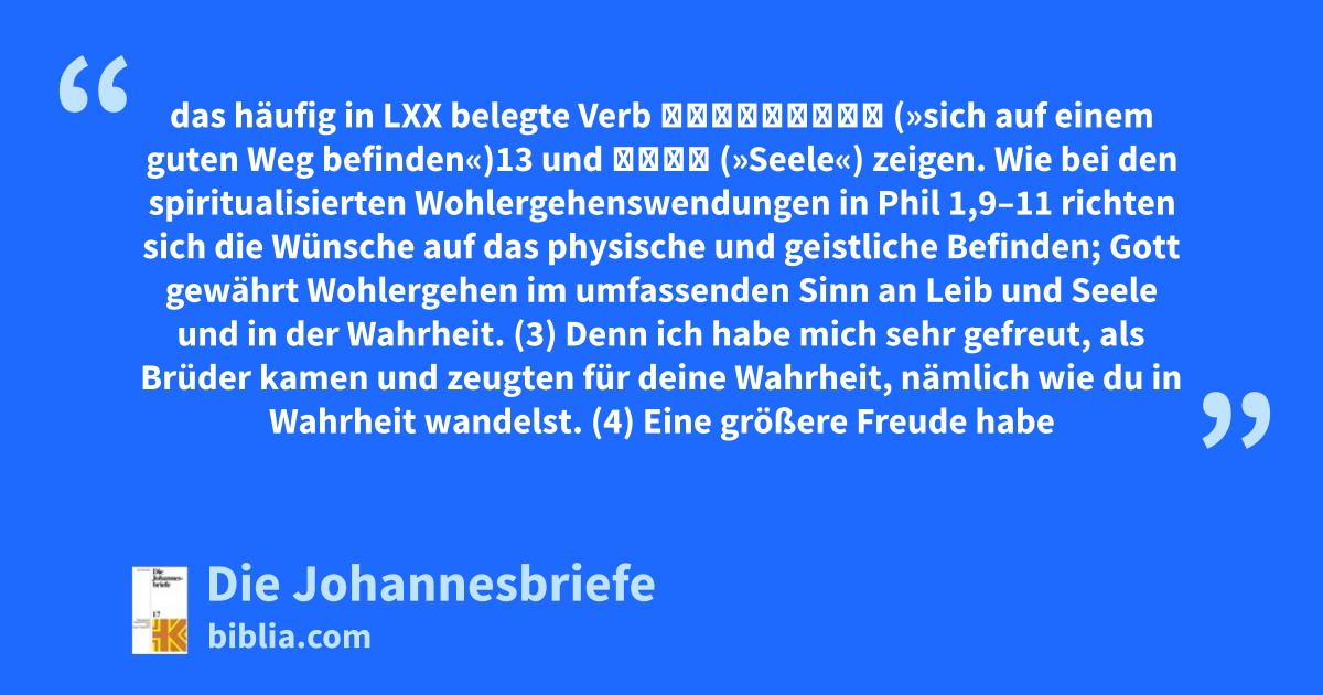das häufig in LXX belegte Verb εὐδοῦσθαι (»sich auf einem guten Weg befinden«)13 und ψυχή (»Seele«) zeigen. Wie bei den spiritualisierten Wohlergehenswendungen in Phil 1,9–11 richten sich die Wünsche auf das physische und geistliche Befinden; Gott gewährt Wohlergehen im umfassenden Sinn an Leib und Seele und in der Wahrheit. (3) Denn ich habe mich sehr gefreut, als Brüder kamen und zeugten für deine Wahrheit, nämlich wie du in Wahrheit wandelst. (4) Eine größere Freude habe