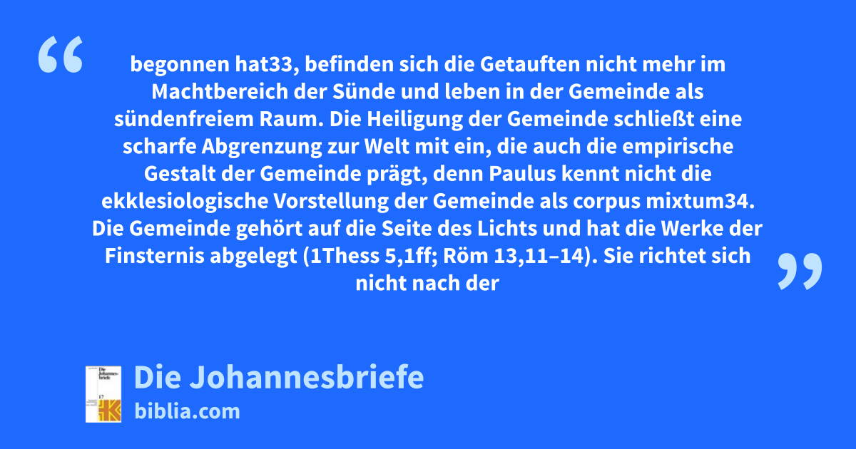 begonnen hat33, befinden sich die Getauften nicht mehr im Machtbereich der Sünde und leben in der Gemeinde als sündenfreiem Raum. Die Heiligung der Gemeinde schließt eine scharfe Abgrenzung zur Welt mit ein, die auch die empirische Gestalt der Gemeinde prägt, denn Paulus kennt nicht die ekklesiologische Vorstellung der Gemeinde als corpus mixtum34. Die Gemeinde gehört auf die Seite des Lichts und hat die Werke der Finsternis abgelegt (1Thess 5,1ff; Röm 13,11–14). Sie richtet sich nicht nach der