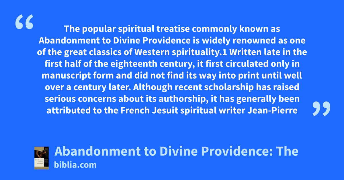 The popular spiritual treatise commonly known as Abandonment to Divine Providence is widely renowned as one of the great classics of Western spirituality.1 Written late in the first half of the eighteenth century, it first circulated only in manuscript form and did not find its way into print until well over a century later. Although recent scholarship has raised serious concerns about its authorship, it has generally been attributed to the French Jesuit spiritual writer Jean-Pierre