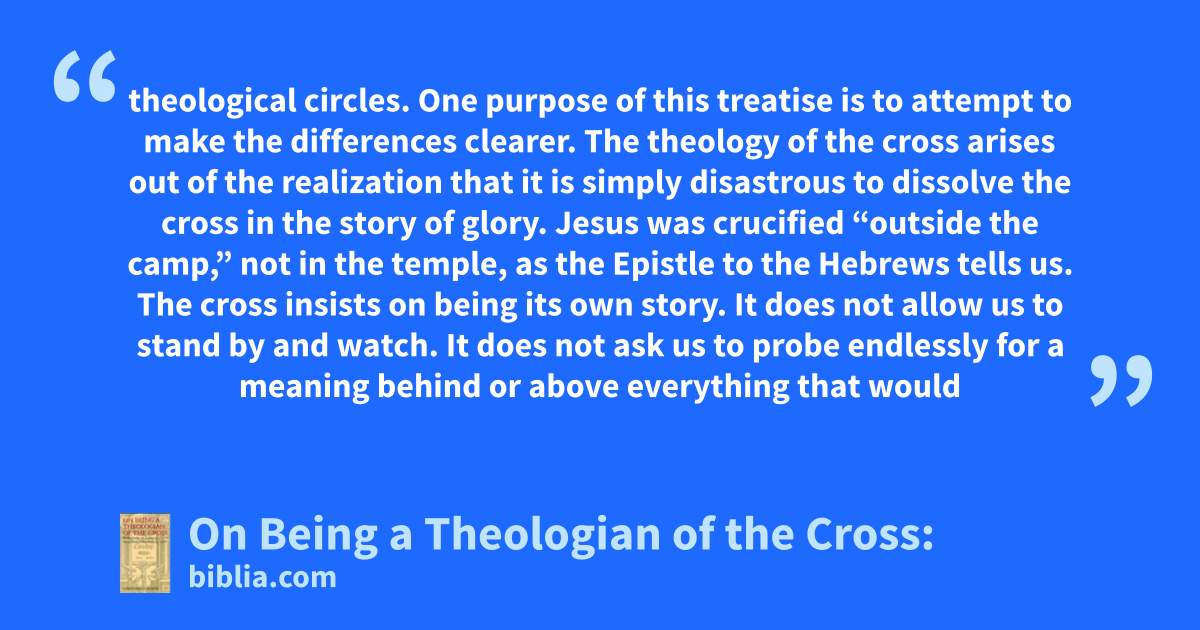 theological circles. One purpose of this treatise is to attempt to make the differences clearer. The theology of the cross arises out of the realization that it is simply disastrous to dissolve the cross in the story of glory. Jesus was crucified “outside the camp,” not in the temple, as the Epistle to the Hebrews tells us. The cross insists on being its own story. It does not allow us to stand by and watch. It does not ask us to probe endlessly for a meaning behind or above everything that would