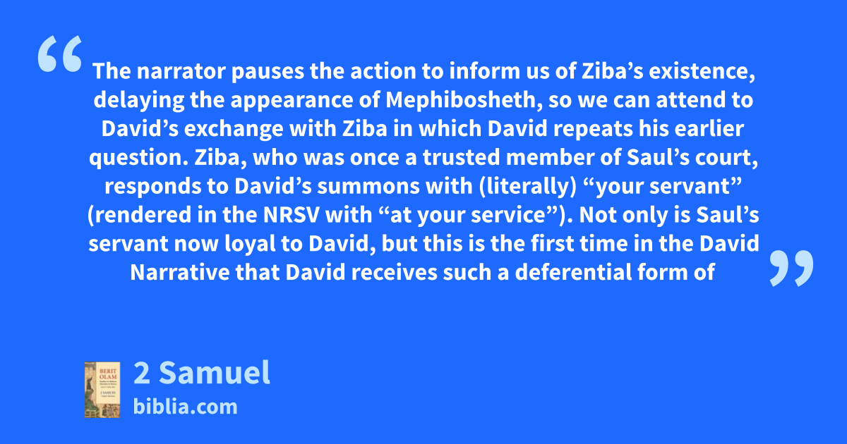The narrator pauses the action to inform us of Ziba’s existence, delaying the appearance of Mephibosheth, so we can attend to David’s exchange with Ziba in which David repeats his earlier question. Ziba, who was once a trusted member of Saul’s court, responds to David’s summons with (literally) “your servant” (rendered in the NRSV with “at your service”). Not only is Saul’s servant now loyal to David, but this is the first time in the David Narrative that David receives such a deferential form of