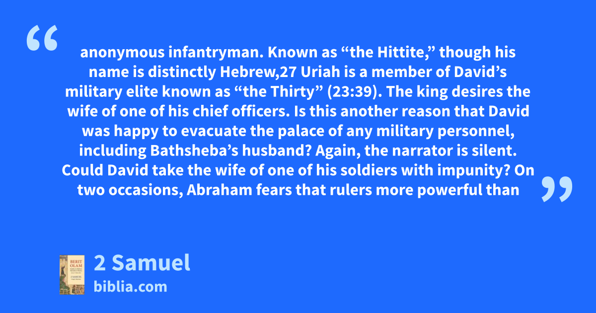 anonymous infantryman. Known as “the Hittite,” though his name is distinctly Hebrew,27 Uriah is a member of David’s military elite known as “the Thirty” (23:39). The king desires the wife of one of his chief officers. Is this another reason that David was happy to evacuate the palace of any military personnel, including Bathsheba’s husband? Again, the narrator is silent. Could David take the wife of one of his soldiers with impunity? On two occasions, Abraham fears that rulers more powerful than