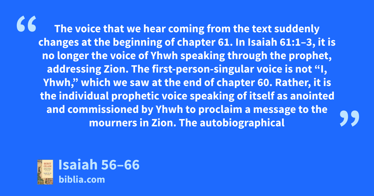 The voice that we hear coming from the text suddenly changes at the beginning of chapter 61. In Isaiah 61:1–3, it is no longer the voice of Yhwh speaking through the prophet, addressing Zion. The first-person-singular voice is not “I, Yhwh,” which we saw at the end of chapter 60. Rather, it is the individual prophetic voice speaking of itself as anointed and commissioned by Yhwh to proclaim a message to the mourners in Zion. The autobiographical