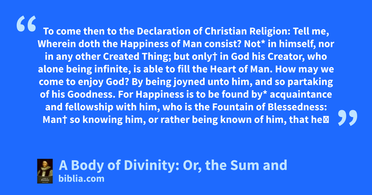 To come then to the Declaration of Christian Religion: Tell me, Wherein doth the Happiness of Man consist? Not* in himself, nor in any other Created Thing; but only† in God his Creator, who alone being infinite, is able to fill the Heart of Man. How may we come to enjoy God? By being joyned unto him, and so partaking of his Goodness. For Happiness is to be found by* acquaintance and fellowship with him, who is the Fountain of Blessedness: Man† so knowing him, or rather being known of him, that heǁ